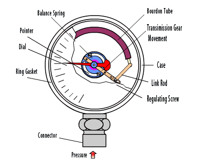 · Prípad: Chráni vnútorný mechanizmus. Materiál je buď plastová, nehrdzavejúca oceľ alebo hliníková zliatina. Niektoré odolné voči šokom tlakové meradlá sú naplnené olejom (ako je silikónový olej alebo glycerín) vo vnútri, aby sa znížili vibrácie.