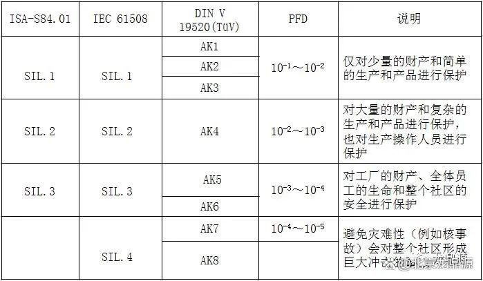 Podľa štandardu IEC je rozdelený na SIL1-SIL4 od nízkych na vysoké, SIL1-SIL3 od Iz 84.01 a AK1-AI8 z nízkych na vysoké podľa DIN V VDE0804. Zodpovedajúci vzťah medzi nimi je nasledujúci.